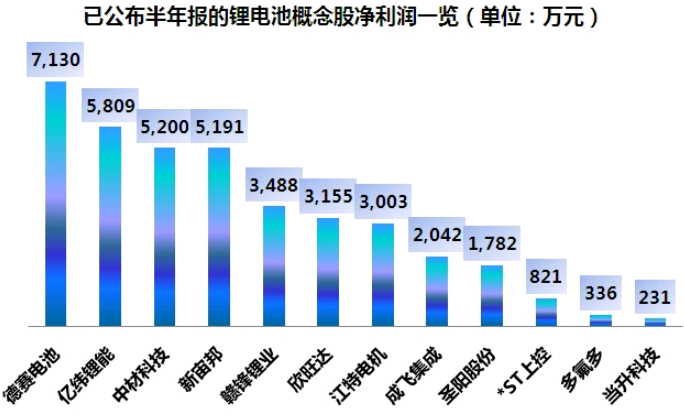 今年炒的如火如荼的美國(guó)新能源汽車特斯拉開(kāi)始接受在華預(yù)定,鋰電池概念股周五早盤(pán)繼續(xù)活躍。該板塊年初至今累計(jì)上漲近50%,是表現(xiàn)較好的概念板塊之一。多只個(gè)股成功翻倍,包括億緯鋰能、德賽電池、中材科技、欣旺達(dá)、金瑞科技。截至8月22日晚間,該板塊有12只個(gè)股公布半年報(bào),其中7公司中報(bào)凈利同比增長(zhǎng),多氟多等5家公司中報(bào)凈利有所下滑,但12家公司都實(shí)現(xiàn)不成程度盈利,詳情如下圖所示。