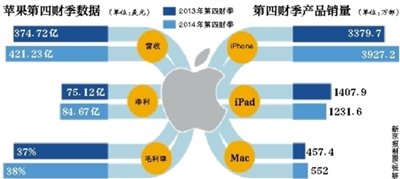 在截至2014年9月27日的第四財季,蘋果營收421億美元,同比去年第四財季的375億美元上升12%。凈利潤84.67億美元,比去年同期的75.12億美元增長13%。受此消息影響,蘋果股價昨日大漲2.14%,收盤每股99.76美元。