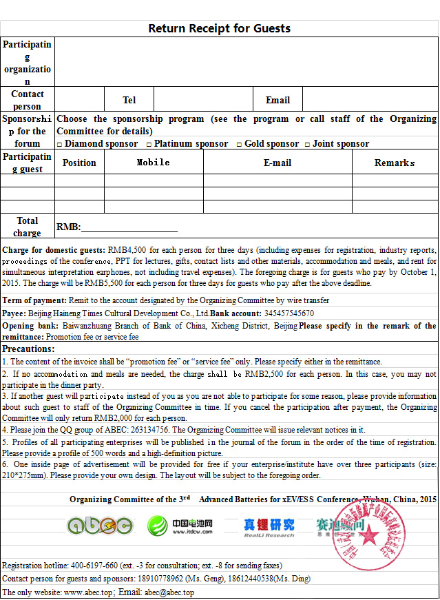 The organizing committee of the 3rd Advanced Batteries for xEV/ESS Conference, Wuhan, China, 2015 hereby sincerely invites you to participate in the forum! Thanks! (Appendices: Return Receipt for Participation, Profile of ABEC, etc.)