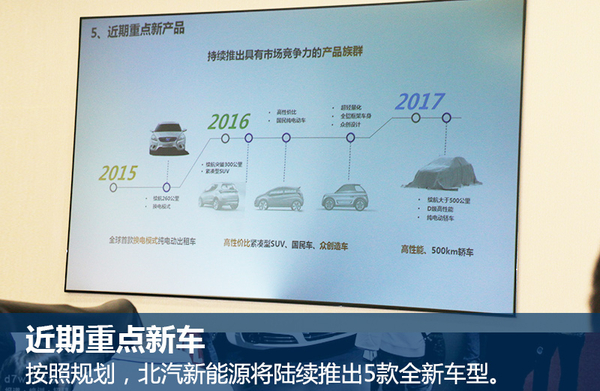 北汽新能源將推出5款全新車型,其中純電動A級車EU260(續航里程260公里)將于2-3月正式上市,接下來純電動A0級SUV—EX200(續航200公里)將于3-4月登陸市場,其后續推出的高里程版續航可達到300公里。在今年的9-10月份,旗下全新A00級“國民車”將上市,該車將進一步拉低入門售價;今年年底,全新“眾創”品牌旗下車型將上市,進一步豐富產品陣容。2017年,北汽新能源將推出全新D級高性能純電動轎車,其續航里程將超過500公里。