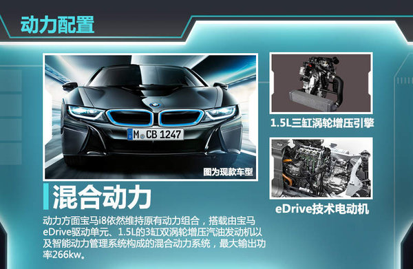 動力方面寶馬i8依然維持原有動力組合,搭載由寶馬eDrive驅動單元、1.5L的3缸雙渦輪增壓汽油發動機以及智能動力管理系統構成的混合動力系統,最大輸出功率266kw。其中1.5T發動機驅動后輪,最大輸出功率為170kW,而eDrive技術電動機則驅動前輪,最大輸出功率為96kW。在此款動力系統的驅動下,寶馬i8的百公里加速只用4.4秒,最高時速達250km/h,而純電模式下最高速度可達120km/h,行駛里程37km,最大續航里程為500km。此外值得一提的是,寶馬i8的百公里綜合油耗僅為2.1L。