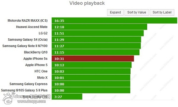 iPhone 5s視頻播放時(shí)間為10小時(shí)31分,跟上一個(gè)環(huán)節(jié)的測(cè)試結(jié)果一樣,iPhone 5與iPhone 5s的差距非常小。