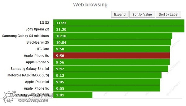 iPhone 5s在Wi-Fi環(huán)境下的網(wǎng)頁(yè)瀏覽時(shí)間為9小時(shí)58分,表現(xiàn)是很不錯(cuò)的,不過(guò)iPhone 5與iPhone 5s的差距僅僅只有2分鐘。