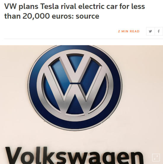 大眾計(jì)劃推出售價(jià)不到2萬歐元電動汽車與特斯拉競爭