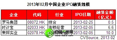 2013年2月上市的3家中國企業全部集中于香港資本市場,包括廣東省鋁產品制造商榮陽實業(02078.HK)、香港手表發展商及零售商時計寶(02033.HK)以及向客戶提供評估及技術顧問服務的企業羅馬集團(08072.HK)(見表1)。