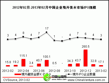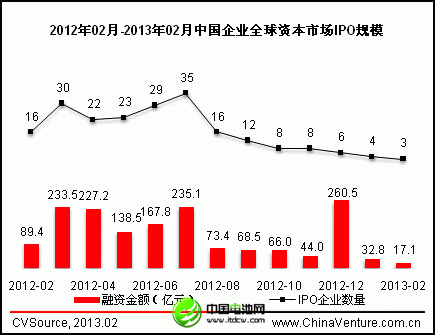 2013年2月,僅有3家中國企業在全球資本市場完成IPO,合計融資17.1億元,環比下降48%,同比下降80.9%。從單筆融資金額來看,本月平均單筆融資規模為5.7億元,較上月有所回落。