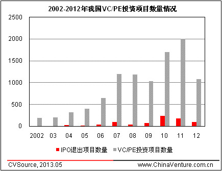 圖1 2002-2012年我國(guó)VC/PE投資項(xiàng)目數(shù)量情況