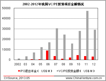 圖2 2002-2012年我國(guó)VC/PE投資項(xiàng)目金額情況