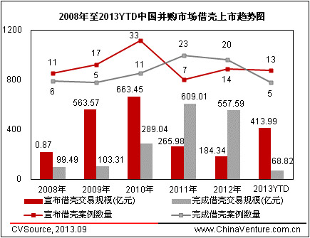 圖1 2008年至2013YTD中國(guó)并購(gòu)市場(chǎng)借殼上市趨勢(shì)圖