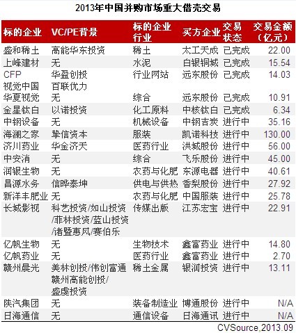 表1 2013年中國(guó)并購(gòu)市場(chǎng)重大借殼交易
