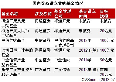 2012年11月,中國證券業協會發布《證券公司直接投資業務規范》,其中在直投基金的種類上進行了列舉和明確,即“直投子公司及其下屬機構可以設立和管理股權投資基金、創業投資基金、并購基金、夾層基金等直投基金”。該文件的發布為券商直投設立并購基金提供了直接的政策依據。國內如中金、中信、廣發、海通證券等紛紛通過旗下直投子公司試水并購基金,如中金在2011年成立目標規模50億元的中金佳泰產業整合基金、中信在2012年成立目標規模100億元的中信產業并購基金(見表1)。