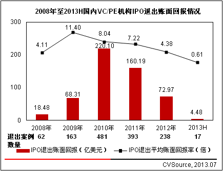 2009年創業板的開啟,為國內VC/PE機構開啟“暴利時代”,根據ChinaVenture投中集團統計,2008年至2013年上半年,國內VC/PE機構通過226家企業上市實現IPO退出,賬面回報率在2009年達到歷史最高值11.4倍后開始逐年下降,今年上半年共有17家企業登陸境外資本市場(16家港股,1家美股),平均賬面回報率跌至0.61倍,創歷史新低。