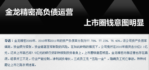 金龍精密于2011年1月25日召開第一次臨時股東大會,通過《關于股份公司股票發(fā)行前滾存利潤分配的議案》,以2010年12月31日的總股本42000萬股為基數(shù),公司向全體股東每10股派送現(xiàn)金紅利5元(含稅),共計分配利潤21000萬元。而在巨額現(xiàn)金分紅背后,卻隱藏著金龍精密資金鏈隨時斷裂的風險。在大額虧欠銀行貸款情況下,金龍精密緣何堅持現(xiàn)金分紅?為何金龍精密還未上市,已經(jīng)將高達7.5億銀行貸款轉嫁到投資者身上?上市圈錢意圖明顯。