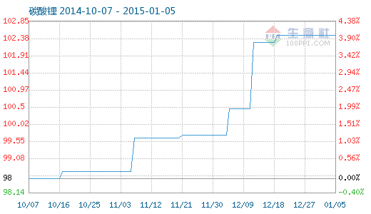 1月5日碳酸鋰商品指數(shù)為102.46,與昨日持平,較周期內(nèi)最高點(diǎn)112.10點(diǎn)(2012-11-04)下降了8.60%,較2014年10月16日最低點(diǎn)98.54點(diǎn)上漲了3.98%。(注:周期指2011-09-01至今)。