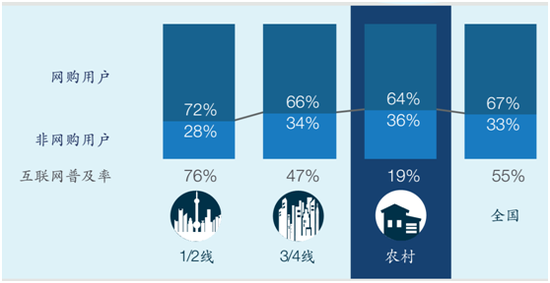 在具體數(shù)字上,第一互聯(lián)網(wǎng)的普及率在一二線達(dá)到76%,到三四線是47%,到農(nóng)村19%,但是在被滲透的這些人群當(dāng)中,用過(guò)電子商務(wù)網(wǎng)購(gòu)用戶,19%普及互聯(lián)網(wǎng)的人群里面有64%用過(guò)網(wǎng)購(gòu)。
