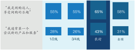 第四,盡管互聯(lián)網(wǎng)在三四線城市和農(nóng)村普及率較低,但這些地區(qū)的大部分消費(fèi)者都在使用電子商務(wù),網(wǎng)購(gòu)的比例分別達(dá)到了68%和60%。農(nóng)村用戶中的“網(wǎng)絡(luò)達(dá)人”更是比一線及二線城市多出25%,渴望第一個(gè)嘗試新的產(chǎn)品和服務(wù)。