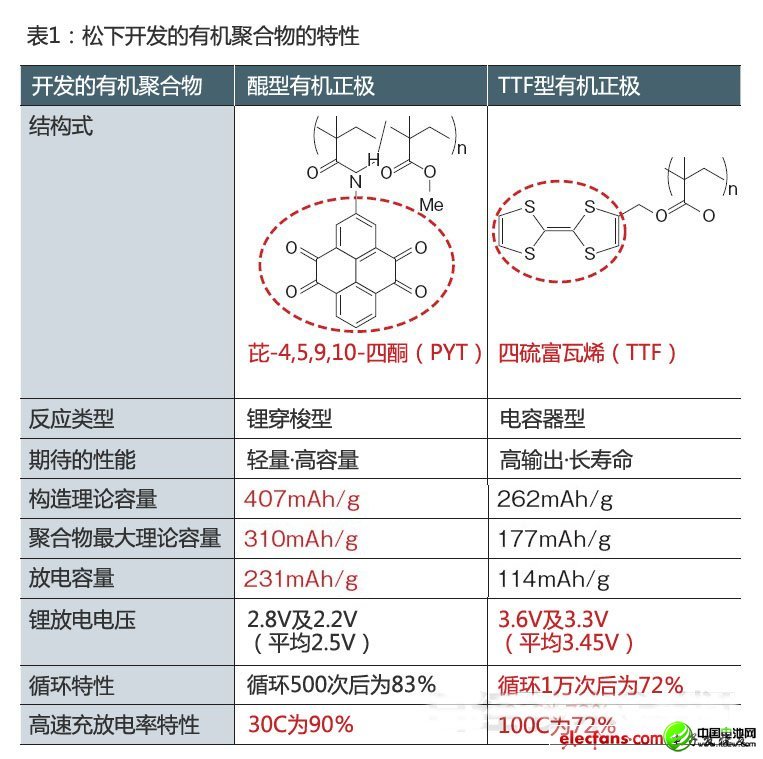 松下正在開發能量密度高的醌型和輸出密度高的TTF型有機充電電池。(圖:松下)