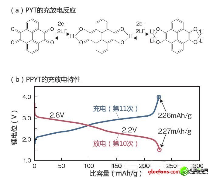 醌型采用了可實現四電子反應的PYT(a)。高分子化的PPYT的平均電壓為2.5V(b)。(圖:松下)