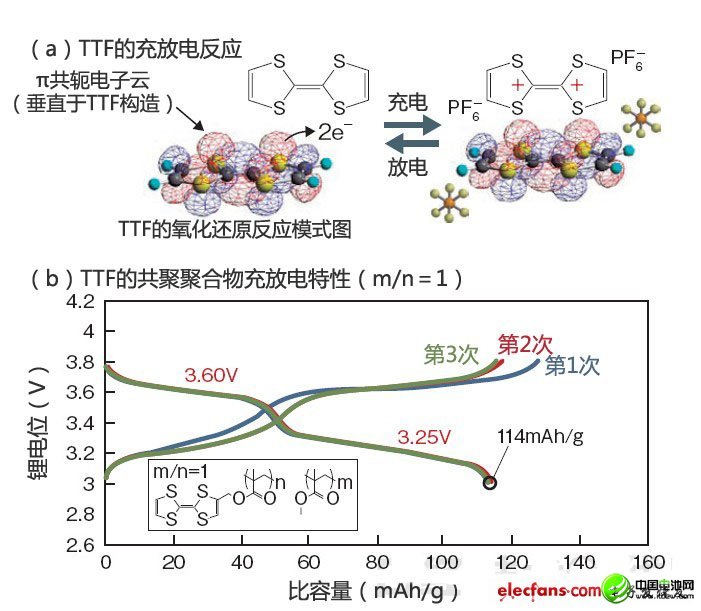 TTF型的氧化還元利用了π共軛電子云(a)。共聚TTF聚合物的平均電壓為3.45V(b)。(圖:松下)