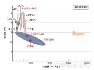 從圖1可以看到,理論能量密度比OLO更高的正極材料還有很多,如Li2MPO4F、LiMSiO4、有機(jī)化合物等,特別是有機(jī)化合物,理論容量最大可達(dá)到近1,000mAh/g。而且不使用重金屬。因此具備重量輕,資源限制少的優(yōu)勢。不過,有機(jī)化合物正極材料的理論能量密度雖然很高,但是鋰電位卻比較低,大多只有2~3.5V。因此,要想實(shí)現(xiàn)與目前的鋰離子電池相同的能量密度,至少要找到具備400~600mAh/g容量的有機(jī)化合物。目前也有很多日本企業(yè)在這方面努力,其中就包括松下、本田、村田制作所(Murata,電子零件專業(yè)制造商,已深入鋰電領(lǐng)域)等知名企業(yè)。