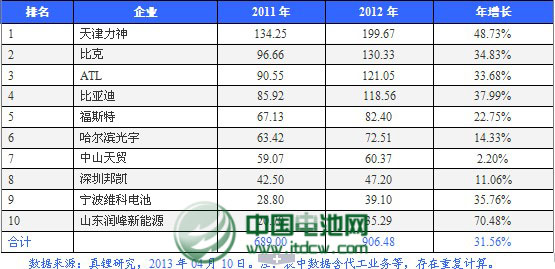 2012年中國鋰離子電池電芯企業(yè)前10強(qiáng)(以產(chǎn)銷量計)     單位:萬kWh