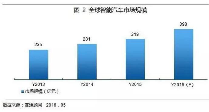 在全球市場(chǎng)上,全球輔助駕駛系統(tǒng)的市場(chǎng)規(guī)模約319億元。結(jié)合目前全球輔助駕駛系統(tǒng)2%~5%左右的滲透率,實(shí)現(xiàn)L1階段的輔助駕駛功能需要500美元左右的投入,實(shí)現(xiàn)L2階段的輔助駕駛功能需要1650美元左右的投入。賽迪顧問(wèn)研究認(rèn)為,2015年全球輔助駕駛系統(tǒng)帶來(lái)的市場(chǎng)規(guī)模約319億元,預(yù)計(jì)2016年全球汽車銷量突破9000萬(wàn)輛,輔助駕駛系統(tǒng)市場(chǎng)規(guī)模有望達(dá)到398億元,如圖2所示。