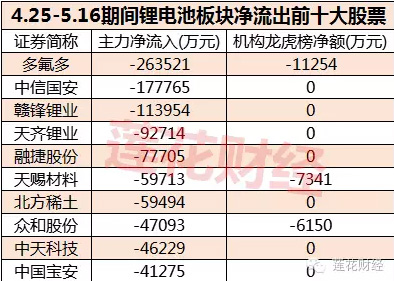 另據東方財富Choice數據統計發現,近期(4.25-5.16)主力資金近期撤出了多只鋰電池概念牛股,多氟多、天齊鋰業、天賜材料都位居主力資金凈流出前列。