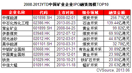 表1 2008-2013YTD中國礦業企業IPO融資規模TOP10