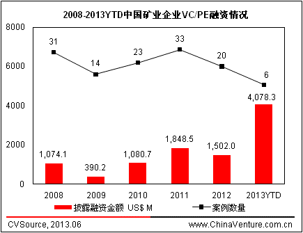 圖1 2008-2013YTD中國礦業企業VC/PE融資情況