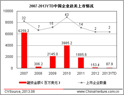 根據ChinaVenture投中集團旗下數據產品CVSource統計顯示,2010年共有43家企業赴美上市,融資金額高達39.9億美元,達到金融危機之后的高峰。2011年以來,受中概股誠信危機、做空機構狙擊、估值偏低以及中美會計監管制度差異等諸多因素困擾,曾經廣受追捧的中概股陷入冰點。與2010年43家中國企業赴美上市融資的盛況相比,2012年僅有唯品會和歡聚時代兩家中國企業成功赴美上市,中國企業赴美上市數量銳減。2013年至今,只有蘭亭集勢和鱸鄉小貸兩家中國企業成功赴美上市,累計融資8785萬美元(見圖1)。