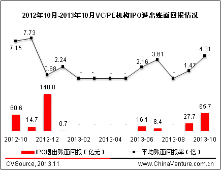 2013年10月,共有16家中國企業(yè)完成IPO,累計融資65.6億元,IPO企業(yè)數(shù)量連續(xù)兩月增加,創(chuàng)下年內新高。機構退出方面,2013年10月,共有4家VC/PE背景企業(yè)成功登陸資本市場,合計融資38.4億元,占比達到58.6%;10家投資機構共實現(xiàn)10筆退出,合計獲得賬面退出回報65.7億元,平均賬面回報率為4.31倍,IPO退出平均賬面回報率企穩(wěn)回升。