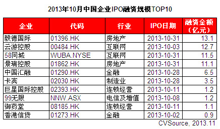 表1 2013年10月中國企業(yè)IPO融資規(guī)模TOP10