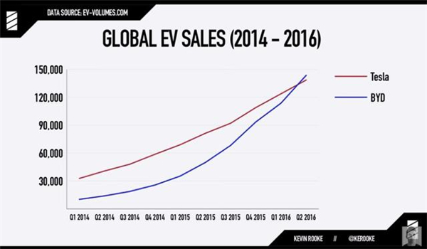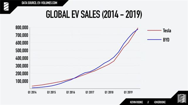 根據Kevin Rooke的統計,與比亞迪同樣成立于2003年的特斯拉,在2016年前,銷量一直都在比亞迪之上,直到2016年1月左右,比亞迪整體銷量才超過了特斯拉,并在長達三年的時間里始終保持全球新能源汽車銷量第一。但隨著 Model 3 產能的釋放,截至今年10月,特斯拉再次實現了反超。