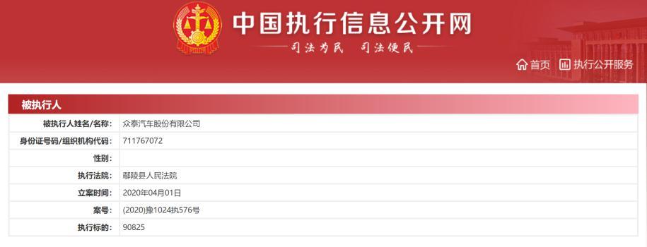 眾泰汽車的麻煩不止于此。據天眼查消息,因買賣合同糾紛,眾泰汽車股份有限公司董事長金浙勇已于4月4日被鄢陵縣人民法院發布限制消費令。中國執行信息公開網顯示,該案的執行標的為9.08萬元。