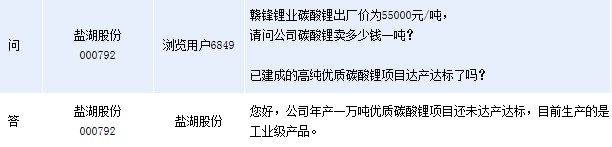 周一鹽湖股份(000792)在全景網互動平臺上表示,公司年產一萬噸優質碳酸鋰項目還未達產達標,目前生產的是工業級產品。