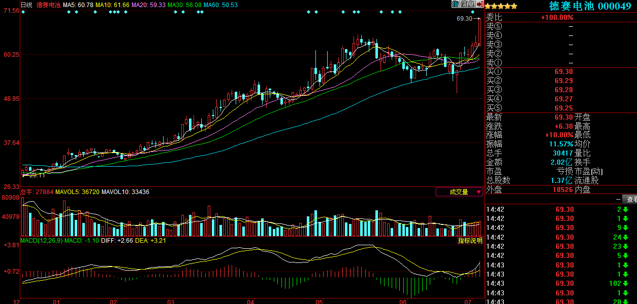 3日下午,鋰電池概念龍頭上市公司再現(xiàn)漲停效應(yīng),德賽電池(000049)一舉拉上漲停,機構(gòu)做多痕跡明顯,同時德賽電池創(chuàng)出自2010年11月17日上市以來的新高:69.30元。