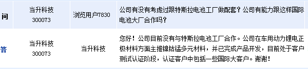 周四在全景網(wǎng)互動平臺上表示,公司目前沒有與特斯拉電池工廠合作。公司在車用動力鋰電正極材料方面主推鎳鈷錳多元材料,并已完成產(chǎn)品開發(fā),目前處于客戶測試認(rèn)證階段,認(rèn)證客戶中包括一些國際大客戶。