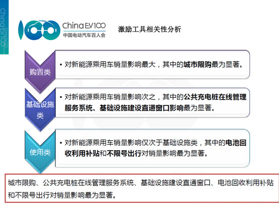 研究發現,目前我國新能源乘用車推廣主要依賴政策和激勵工具,各城市激勵工具總量和種類對新能源乘用車銷量有顯著影響;激勵工具中城市限購對新能源乘用車銷量影響最大,相比而言,現階段購置補貼對新能源乘用車銷量影響沒有期望中那么大。