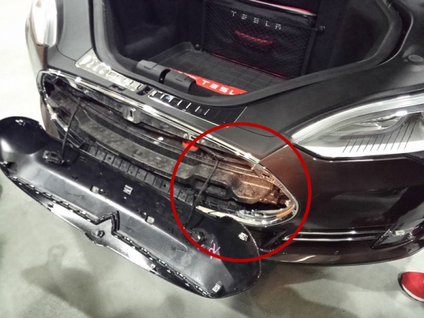 工作人員拆開了車的前唇蓋,而拖車鉤就隱藏在其右側(cè)的空隙內(nèi) 車廂應(yīng)急逃脫 在Model S前后兩個(gè)車廂,特斯拉都安裝了應(yīng)急按鈕,這是為了防止發(fā)生意外被