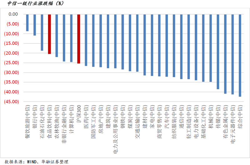 食品飲料行業2018年下跌20.37%,排名第4位,跑贏滬深300指數4.94個百分點。在市場低迷的背景下,防御性凸顯。