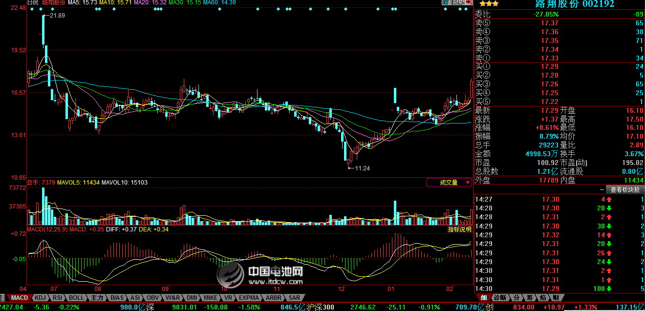 【本網訊】2月18日,蛇年股市開盤,鋰電池板塊再次受到資金面關注。領頭羊路翔股份(002192)強勢上揚,開盤16.10元,截止到12:16收在17.33元,漲幅為8.86%。消息面上,春節期間,智利、秘魯和