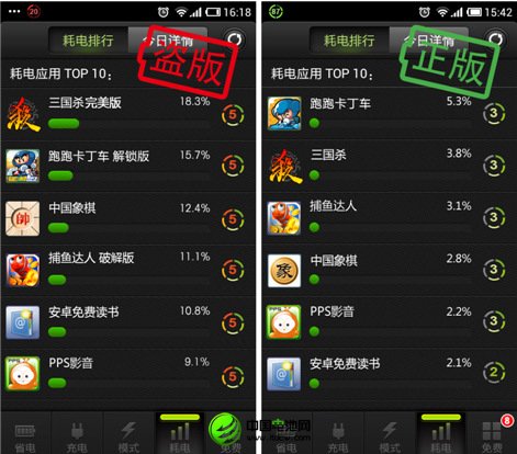 金山電池醫(yī)生耗電排行榜顯示,被修改后的盜版應用相比與正版耗電增加數(shù)倍
