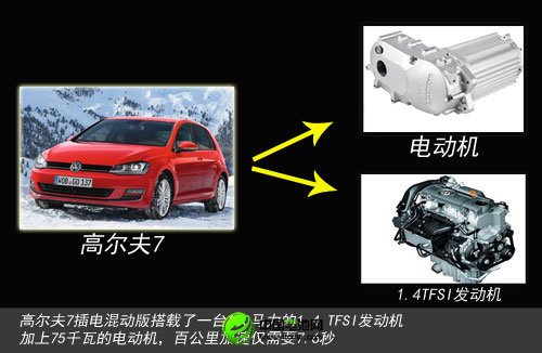 2012年大眾推出了高爾夫第七代車型,而第七代高爾夫除了有純電動版本之外,還將推出插電式混合動力車型,計劃將于明年上市銷售,新車動力系統由一臺1.4L TFSI發動機和一臺電動機組成。此外,高爾夫7插電式混動版的百公里油耗僅1.5升,二氧化碳排放量只有35克/公里。