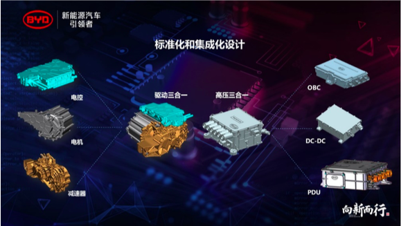 比亞迪的e平臺(tái)可以概括為33111,其中兩個(gè)“3”分別指的是驅(qū)動(dòng)3 合1 和高壓3 合1。 3 個(gè)“1”就是1 塊板、1 塊屏和1 塊電池。