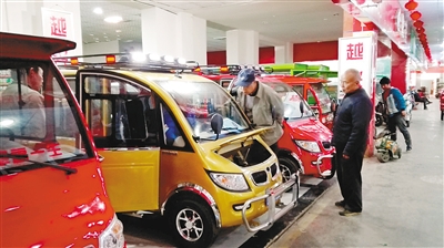 在太華路電動車批發市場內,一對50多歲的夫妻坐在一輛四輪電動車里聽銷售人員詳細介紹。