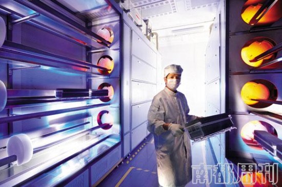 3月的無(wú)錫陰雨綿綿。一位正在值班的女保安,正對(duì)著門(mén)口一幅“無(wú)錫尚德感謝社會(huì)各界支持”的條幅發(fā)呆。分布在周邊的幾個(gè)工廠,開(kāi)工率不足50%,一些員工被強(qiáng)制性地開(kāi)始休假。對(duì)面,則是傳說(shuō)中光設(shè)計(jì)費(fèi)就花了上億元的生態(tài)大樓。黑色幕墻、流線型設(shè)計(jì)、精心修飾過(guò)的辦公室,聚集了尚德電力的核心管理層。