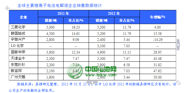 中國電池網(wǎng)-中國電池雜志戰(zhàn)略合作機構(gòu)——真鋰研究所指的全球主要的電解液企業(yè)指年銷量在2,000噸以上的企業(yè),依據(jù)這個標(biāo)準(zhǔn),2012年全球主要的電解液企業(yè)有三菱化學(xué)、宇部興產(chǎn)、韓國旭成、LG化學(xué)、國泰華榮、天津金牛、東莞杉杉、新宙邦、廣州天賜等。這9家企業(yè)2012年的市場份額共計73.70%,不過較2011年相比有所下降。這些主要企業(yè)近兩年的市場份額變化情況見下表。