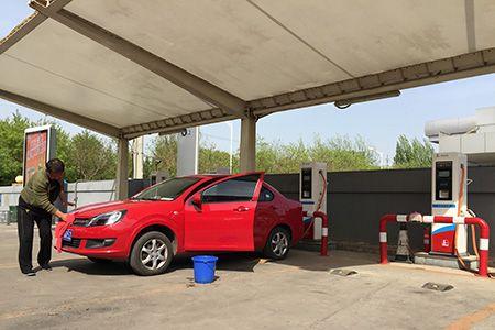 與上面這位苦逼哈哈的學弟道別后,在他的指引下樂逗很快的就找到了中國石化廣澤橋加油站。與一般加油站不同的是,這里門口的大牌子上標示有“直流充電”幾個大字。走進去后發現,與加油站面對面的圍墻旁邊安裝有一排共四個大的直流充電站,一輛紅色的江淮iev4正在最靠里的充電樁上充電,車主則在拿水桶和毛巾認真地擦拭自己的愛車。