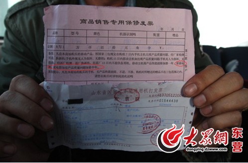 在網(wǎng)友“老兵”提供的保修發(fā)票里清楚的寫著,“原裝電池、充電器如有產(chǎn)品質(zhì)量問題保修半年。”