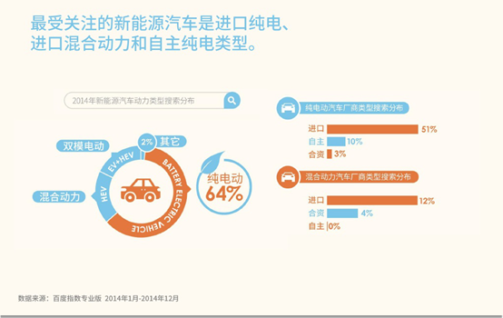 在2014年百度搜索中網(wǎng)民對新能源汽車搜索量增長108%,而國內(nèi)新能源汽車的銷量也達(dá)到270%的增量。該現(xiàn)象表明,在國內(nèi)環(huán)保觀念日益加強(qiáng)、各地良好政策相繼落實(shí)的背景下,中國消費(fèi)對新能源汽車的認(rèn)可度正在逐漸提升,新能源汽車或?qū)Ⅰ側(cè)敫咚偻ǖ馈?/p>